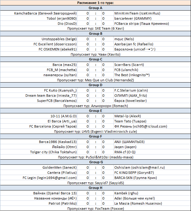 Для начала давайте взглянем на расписание первого тура нашего фэнтези-турнира, дабы уже окончательно узнать имена своих соперников, а также имена тех, кто волею случая пропускает первый тур: