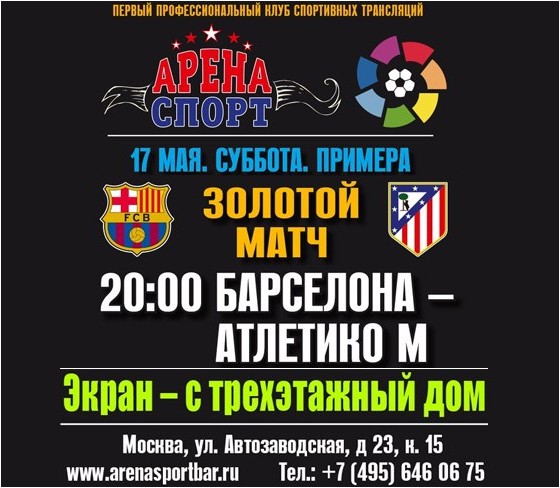 17 мая будет организован совместный просмотр матча за титул чемпиона Испании на самом большом экране Москвы. Болельщиков "Барселоны" в этот день примет заведение "Арена Спорт".