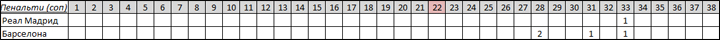 Начнем с самого интересного. После выделенного 22-го тура отрыв Реала возрос до максимальных в прошедшем сезоне десяти очков. В этих самых 22-х стартовых турах Реалу назначали десять пенальти, в то время как Барселоне всего три. Зато в последних девяти турах в ворота соперников Барсы было назначено аж семь пенальти.