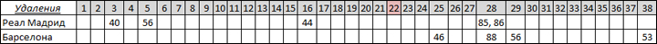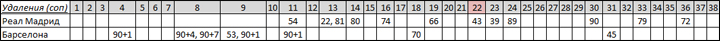 12 красных карточек футболистам соперников мадридского Реала со средним временем удаления - 73-я минута матча. В то время как у соперников Барселоны восемь удалений и больше половины были уже в добавленное время. Средняя минута удалений - 87-я.