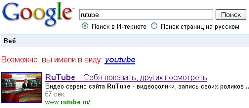 Google.ru при скромном запросе "rutube" ненавязчиво предлагает поискать "youtube"