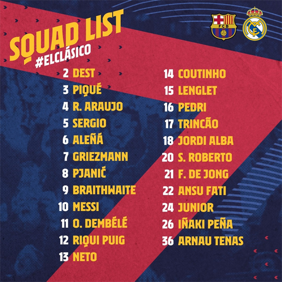 Таким образом, полный список выглядит следующим образом: Дест, Пике, Араухо, Бускетс, Аленья, Гризманн, Пьянич, Брейтуэйт, Месси, Дембеле, Пуч, Нето, Коутиньо, Лангле, Педри, Тринкан, Альба, Роберто, де Йонг, Фати, Фирпо, Пенья и Тенас.