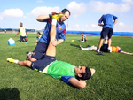 Как и обычно тренировка началась с разогревочных упражнений и пробежки. Затем команда разделилась на две группы: выходивших в основе матча с “Эспаньолом” и остальных. Стоит отметить, что игроки смогли опробовать мяч, которым они будут играть на Мундиале.