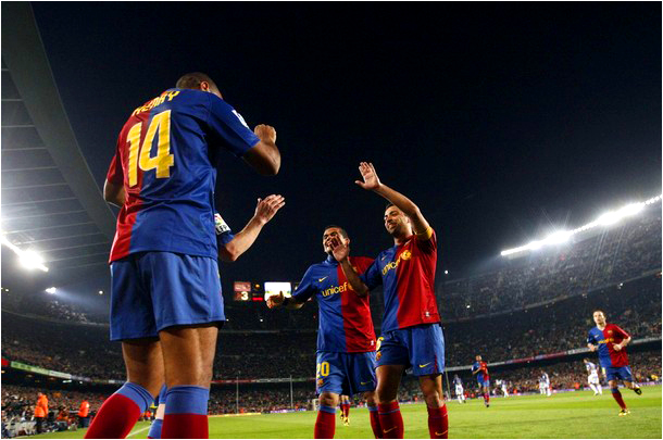 2 мая. Полный разгром мадридского "Реала" на "Сантьяго Бернабеу". В обоих таймах столичный клуб забивал первым, но в ответ получал сразу три гола. Великолепный мяч головой от капитана "Барсы" Карлеса Пуйоля, срывающего и целующего капитанскую повязку в виде каталонского флага. По два гола оформили Месси и Анри, а завершил разгром еще один центральный защитник - Пике, который забил сотый мяч "Барселоны" в розыгрыше Примеры 2008/09. Четыре голевые передачи сделал Чави Эрнандес. После этого матча стало очевидно, что каталонская команда никому не уступит первую строчку в чемпионате. Видео. Фотогалерея.