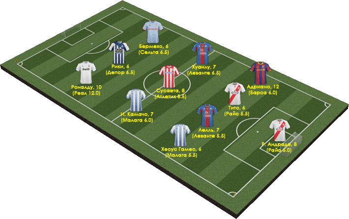 Райо Вальекано:Рубен Андраде(8), Касадо(5), Жорди Амат(5), Тито(6), Хосе Карлос(3) (Хименес(6), 70), Адриан(3), Бангура(2) (Рамиро(2), 63), Трашоррас(3) (Гальвес(0), 74), Фуэго(2), Каррильо(2), Нильсен(2)