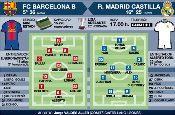 В 23 турах "Барселона Б" и "Реал Мадрид Кастилья" на двоих забили 89 голов (49 — каталонцы, 40 — мадридцы), а также пропустили 74 мяча (36 — каталонцы, 38 — мадридцы), что делает команды самыми результативными во втором испанском дивизионе и в то же время самыми пропускающими. Хрупкая оборона и мощная атака филиалов дает надежду на обилие голов в предстоящей встрече.