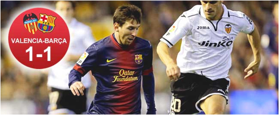 Ничья на "Месталье" не стала большим сюрпризом. Принимая в счет последние результаты матчей между "Барселоной" и "Валенсией" такой исход можно было предположить. Если руководствоваться статистикой "Валенсии" в последних семи турах, не считая прошедшую игру, то "летучие мыши" не сыграли ни одного раза вничью. И вот она случилась. "Барса", несмотря на надежную игру в обороне, пропустила первой после точного удара Эвера Банеги в концовке первого тайма. "Валенсия" была вознаграждена за смелый и напористый футбол, который показывала практически в течение всего матча. Но пятью минутами позже Педро заработал пенальти, его можно назвать так однозначно, изумительно реализованный Лео Месси. Игра не изобиловала острыми атаками и опасными ударами, однако держала в напряжении почти каждую минуту. Несмотря на то что для "Валенсии" матч из-за турнирных раскладов был важнее, игра "Барсы" соответствовала накалу встречи. Моменты для того, чтобы взять три очка, у подопечных Роуры во втором тайме были. Самые явные шансы отличиться имели Фабрегас и Вилья, однако их подвела точность. Но в самой концовке и "Валенсия" также могла вырвать победу. Ничью для команды спас Виктор Вальдес, в блестящем стиле дважды отразивший удары соперника с убойной дистанции. В итоге — ничья, которая позволяет "Барселоне" увеличить преимущество над "Реал Мадрид" до 16 очков. Но у мадридского "Атлетико" есть шанс приблизиться, но для этого подопечным Диего Симеоне сначала предстоит победить крепкий "Бетис".