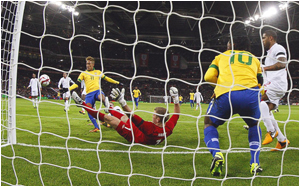 В начале встречи бывший игрок "Барселоны" Роналдинью при навесной подаче в штрафную соперника попал в руку Уилшира, и португальский арбитр Педру Проэнса назначил пенальти. Сам Роналдинью вызвался нанести удар с 11-метровой отметки, но мяч парировал Джо Харт. Мало того, голкипер англичан сумел успеть выбить мяч с ленточки, не дав добить его в ворота все тому же Роналдинью.