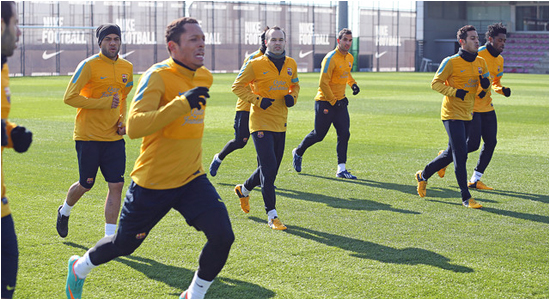 Остальные футболисты занимались в более интенсивном режиме на поле № 1 "Сан-Жоан-Деспи" с мячом, используемым в Королевском кубке. Сине-гранатовые тепло оделись из-за холодной погоды. Вместе с ними работал и вратарь резервной команды — Мигель Баньюс.