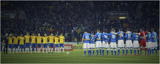 В конце первого тайма пентакампеоны провели две результативные атаки и ушли на перерыв с комфортным преимуществом в счете. Спустя чуть больше десяти минут второго тайма итальянская команда сумела сравнять счет. Сначала Де Росси после подачи углового отквитал один мяч, а через несколько минут шикарный удар из-за пределов штрафной площади нанес Марио Балотелли. Команда Чезаре Пранделли провела убойный второй тайм и была ближе к победе, но в итоге матч завершился вничью — 2:2.