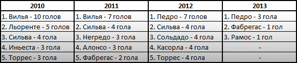 Если в 2012 году лучшим бомбардиром сборной стал Педро, то в 2011 и 2010 годах главным забивалой испанской команды был другой нападающий "Барселоны" — Давид Вилья. Таким образом, уже три года подряд игроки из "Барселоны" становятся лучшими бомбардирами Фурии Рохи.