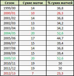 Список команд по количеству сухих матчей в сезоне 2012-13