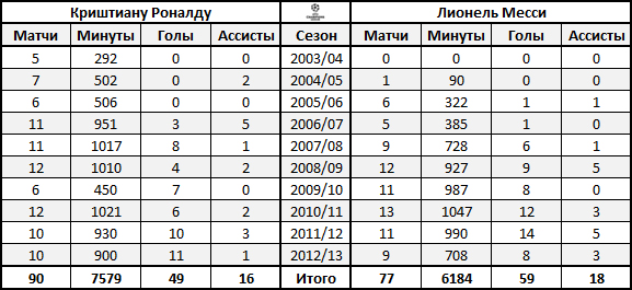 Несмотря на то, что Роналду провел в Лиге чемпионов на 13 матчей больше Месси (а если считать по минутам, то и вовсе на 15,5), аргентинец опережает нападающего "Реала" как по забитым мячам, так и по результативным передачам.