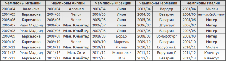 Пять чемпионских званий в последнее десятилетие имеет лионский "Олимпик", но его правление во Франции завершилось еще в 2008 году. Доминантой в Германии остается мюнхенская "Бавария", также имеющая в своем активе пять титулов за десять последних сезонов. В Италии пять скудетто на счету миланского "Интера", но один из них был присужден клубу в связи с Кальчополи.