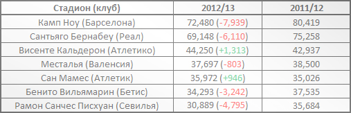 Семерка самых посещаемых стадионов Ла Лиги осталась той же, что и в прошлом сезоне. Но у большинства из них средняя посещаемость по сравнению с предыдущим чемпионатом заметно снизилась.