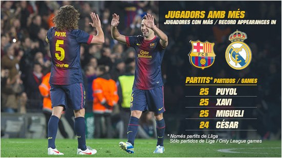 Карлес Пуйоль и Чави Эрнандес являются старожилами Эль Класико. Наряду с Мигели они приняли участие в 25 противостояниях между "Барсой" и "Мадридом" в рамках чемпионата — больше любого другого игрока за всю историю "Барсы". За ними следуют Сесар (24), Решач, Рифе, Сегарра (21), Асенси (19) и Субисаррета (18).