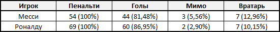 В процентном соотношении реализация Криштиану на 5,5% выше чем у Месси (86,95% против 81,48%). Если посчитать процент голов с пенальти обоих футболистов за всю карьеру (естественно, за вычетом голов в сериях послематчевых пенальти), то Месси из 362 мячей забил с "точки" 43 раза (11,87%), а Роналду из 382 голов — 56 раз (14,65%).