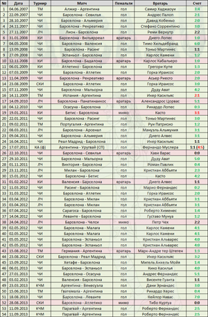 Месси, в свою очередь, не забил пенальти на шестой добавленной минуте матча Ла Лиги против "Севильи" в 2011 году, тем самым лишив "Барселону" двух немаловажных очков, которых команда в итоге недосчитается в чемпионской гонке с "Реалом". В ответном полуфинале Лиги чемпионов против "Челси" в 2012 году аргентинец попал с пенальти в перекладину и вылетел с "Барсой" из турнира в шаге от финала. В августе 2013 на последних минутах матча за Суперкубок с "Атлетико" Месси также поразил перекладину ворот на "Камп Ноу", но в этот раз все завершилось менее трагично. "Барселона" в итоге завоевала трофей за счет правила выездного гола.