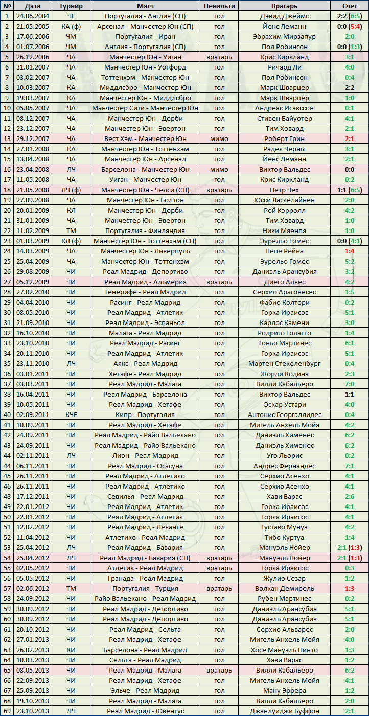 Только двум вратарям удалось не пропустить с пенальти от обоих футболистов. Первым стал Диего Алвеш, который сначала в 2009 году отбил удар Роналду в составе "Альмерии", а в 2012 — удар Месси, будучи игроком "Валенсии". Голкипер "Челси" Петр Чех также сумел отразить удар Роналду, а с ударом Месси ему на помощь пришла перекладина.