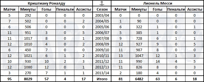 В новой части нашей статистической подборки мы сравним показатели Месси и Роналду в самом престижном европейском клубном турнире — Лиге чемпионов УЕФА.