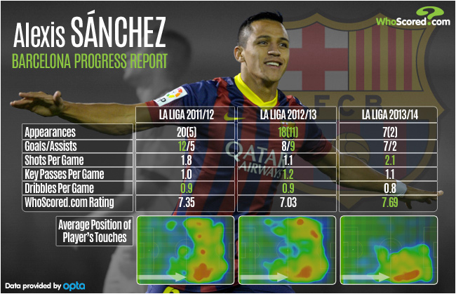 Похоже, что после двух неубедительных сезонов в Испании, Санчес сумел окончательно адаптироваться к новой среде. Возможно, полностью его потенциал не удалось раскрыть Виланове, или еще большая конкуренция за место в составе с приходом Неймара привела его в чувство, но, тем не менее, Алексис в данный момент играет одну из ключевых ролей в команде, демонстрируя впечатляющую результативность.