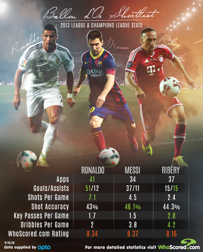 Статистический портал WhoScored опубликовал статистику тройки финалистов на "Золотой мяч" в матчах национального первенства и играх Лиги чемпионов, проведенных в 2013 календарном году.