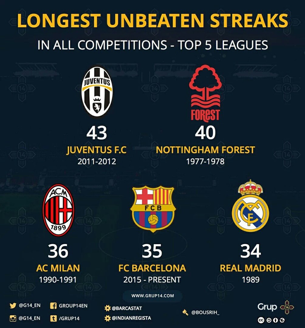 Другую мишень представляет "Ноттингэм Форрест", который в период сезонов-1977-1978 и -1978-1979 одержал 21 победу и 19 раз сыграл вничью, то есть не проигрывал в 40 матчах. "Барса" может догнать английскую команду в Класико.