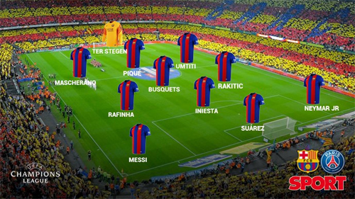 Маск. Пике Умтити Буск. Ракитич. Иньеста Рафинья Неймар Месси Суарес Иньеста помогал в отборе Неймару и Рафе, а центре ракитич иньесте, и это такой лютый прессинг получился, что я сам в шоке был. Хорошая работа лучо.