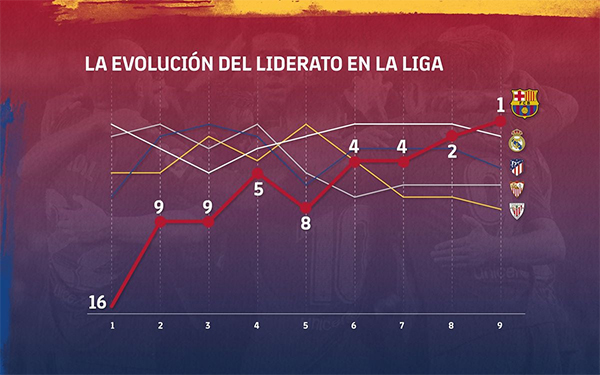 Команда Эрнесто Вальверде в итоге и вовсе превзошла саму себя прошлого года на одно набранное очко, а также лучше показала себя в оборонительных действиях, пропустив к этому отрезку сезона на 1 гол меньше. Таким образом, у сине-гранатовых сейчас в активе 19 очков, на одно больше, чем у команды Зинедина Зидана, на два, чем у "Гранады" (3-е место ) и на три, чем у "Атлетико", который идет последним в лигочемпионской зоне.