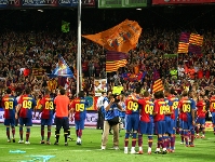 Несмотря на неприятный осадок от игры с “Осасуной” (0-1) и действий арбитра, стадион быстро выбросил все это из головы и приготовился к празднику. На стадионе демонстрировали видео лучших голов сезона, чтобы занять 77.331 человека, ждавших, пока игроки выйдут из раздевалки в футболках, специально подготовленных к празднованию чемпионства. На спине этих футболок была надпись ЧЕМПИОНЫ 09.