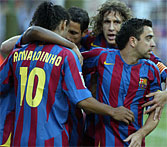 После того, как "Барса" вышла вперед, Роналдинью стал демонстрировать настоящие чудеса и своими финтами не раз вызывал бурные аплодисменты публики, в то время как обороне "Барсы" было не до веселья – Луис Гарсия сумел прорваться к воротам Жоркеры и лишь мастерство вратаря, отбившего мяч ногами, спасло каталонцев. Последним опасным моментом первого тайма можно назвать комбинацию, в ходе которой Роналдинью отдал точный пас на Ларссона, однако Горка Ираизов в прыжке парировал удар шведского нападающего.