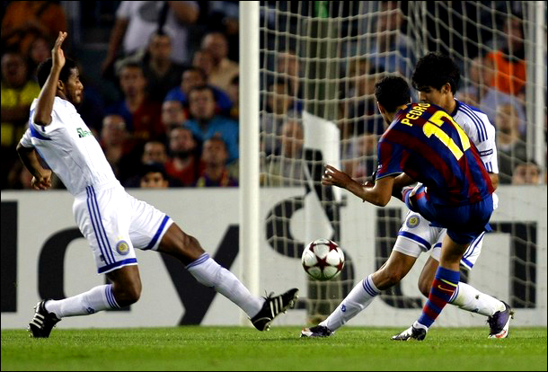 На фото: второй мяч в ворота киевского "Динамо" забивает Педро ("Барселона").
