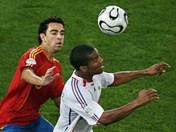 Треугольник, составленный из полузащитников Фабрегаса, Хави и Хаби Алонсо взяли под контроль весь центр поля, пройти который было очень сложно. Французским полузащитникам пришлось забрасывать мячи на Анри, минуя центр поля, при этом нападающий "Арсенала" раза за разом попадал в офсайд, грамотно организуемый испанской обороной. На двадцать седьмой минуте Испания заслуженно повела в счете после гола Давида Вильи, реализовавшего пенальти, который был назначен за фол Тюрама на игроке мадридского "Атлетико" Пабло.