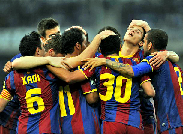 Гости уверенно контролировали мяч в центре поля, демонстрировали зрителям свои фирменные треугольники и держали в напряжении оборону хозяев. И в один прекрасный момент Чави заметил забегание Тиаго, выдал шикарный пас, после которого мяч транзитом через Лео Месси попал к адресату и тот от перекладины вколотил снаряд в ворота.