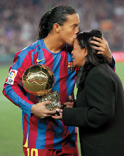 В 2005 году Роналдинью стал лучшим футболистом Европы (на фото с мамой)